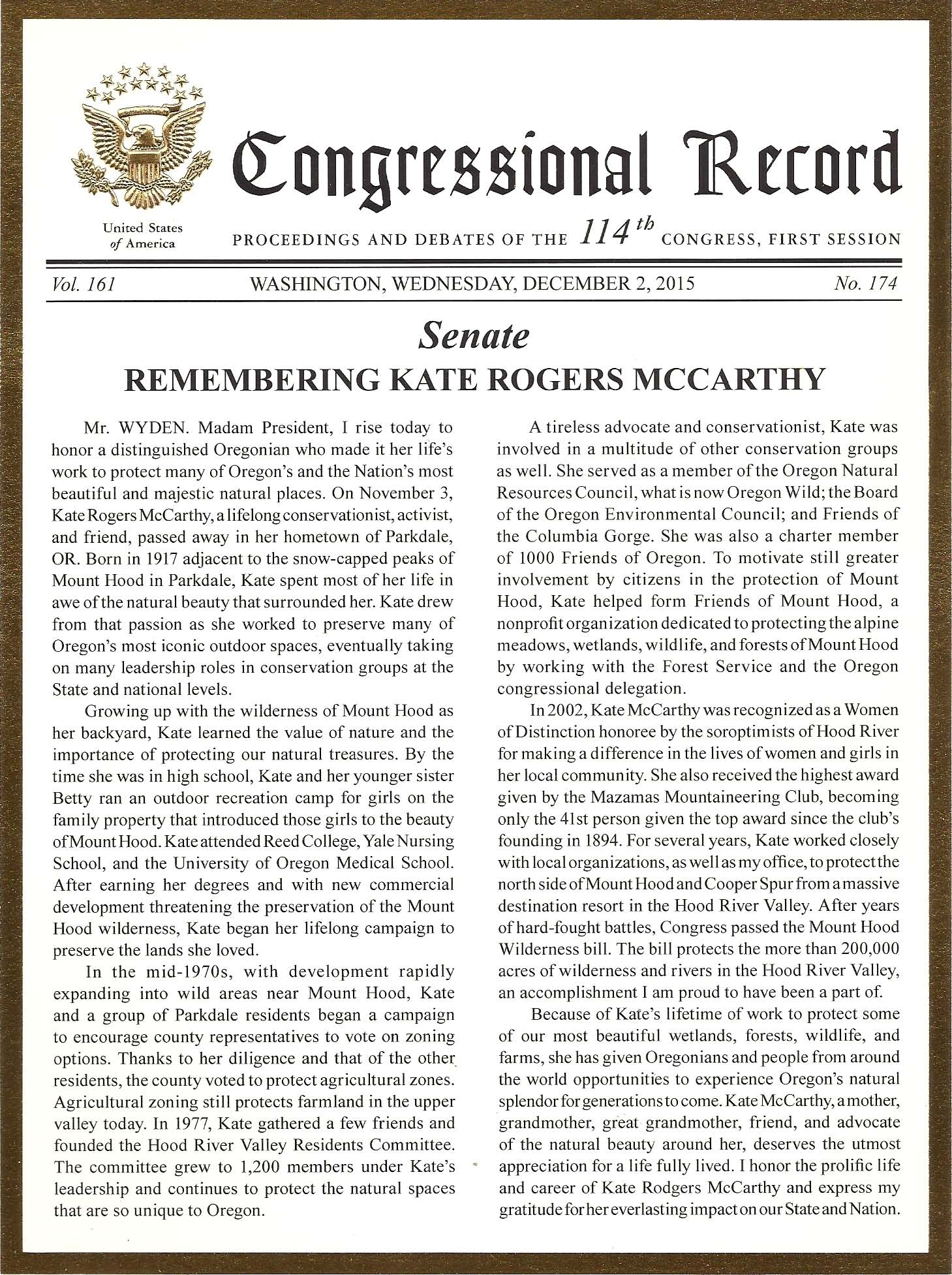 Sen. Ron Wyden of Oregon entered this tribute into the Congressional Record in recognition of the lifetime achievements of Kate McCarthy, founder of FOMH.